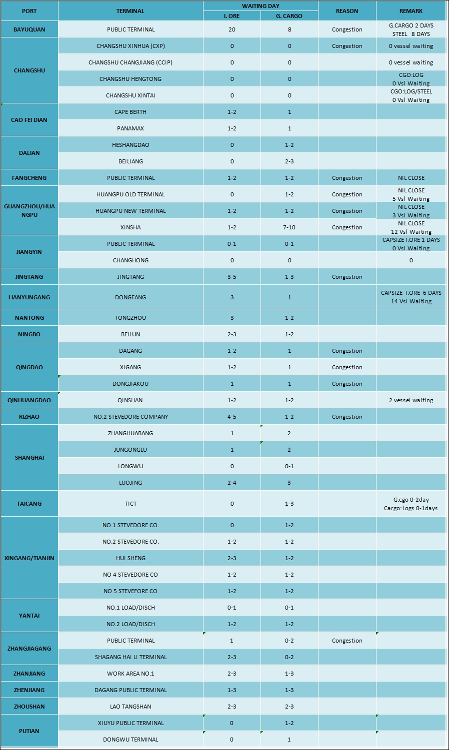 IV. Reference information 1) This above datum was based on our sub-agents in China. We will update your required port if need more information in detail. 2) Some terminals shall be congested due to local cargo congestion. 3) Congestion situation is subject to sudden strong wind, fog, rain, etc. |